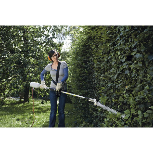 Puissant taille-haie sur perche électrique en version longue. Cet appareil permet de tailler sans difficultés et en toute sécurité depuis le sol des haies très hautes ou particulièrement larges. La possibilité de pouvoir orienter l’outil de coupe sur 125° en fait un outil à usage très polyvalent. Vous avez ainsi facilement accès en toute sécurité au sommet de la haie; tout en économisant du temps et des efforts.